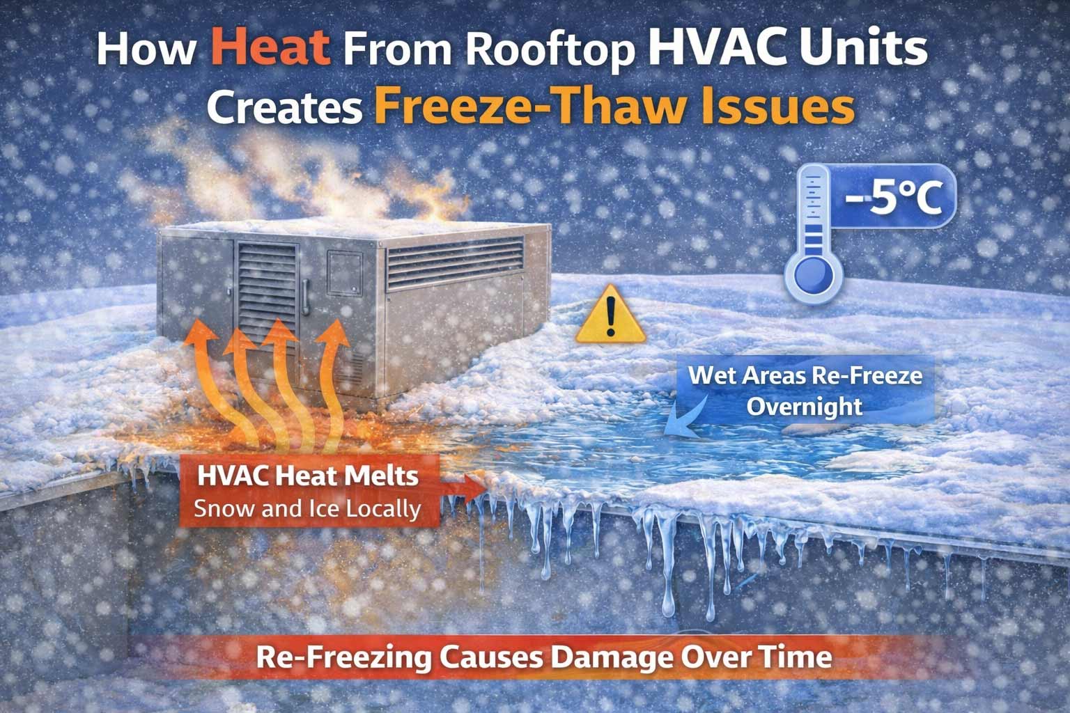 Natural freeze-thaw cycles aren’t the only kind of freeze-thaw issues rooftops encounter. Rooftop HVAC units can leak heat, accelerating freeze-thaw cycles around their bases and poor flashing or ignored roof problems around HVAC systems is a top winter leak point.