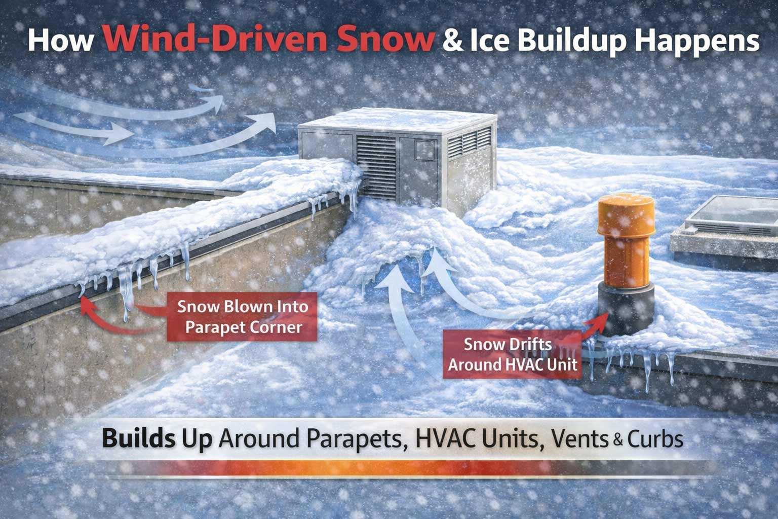 Strong winds can push snow into parapet corners, around HVAC units, or near skylights, creating uneven buildup and localized stresses in vulnerable areas that would otherwise not be susceptible to ice damming or backup from a blocked drain.